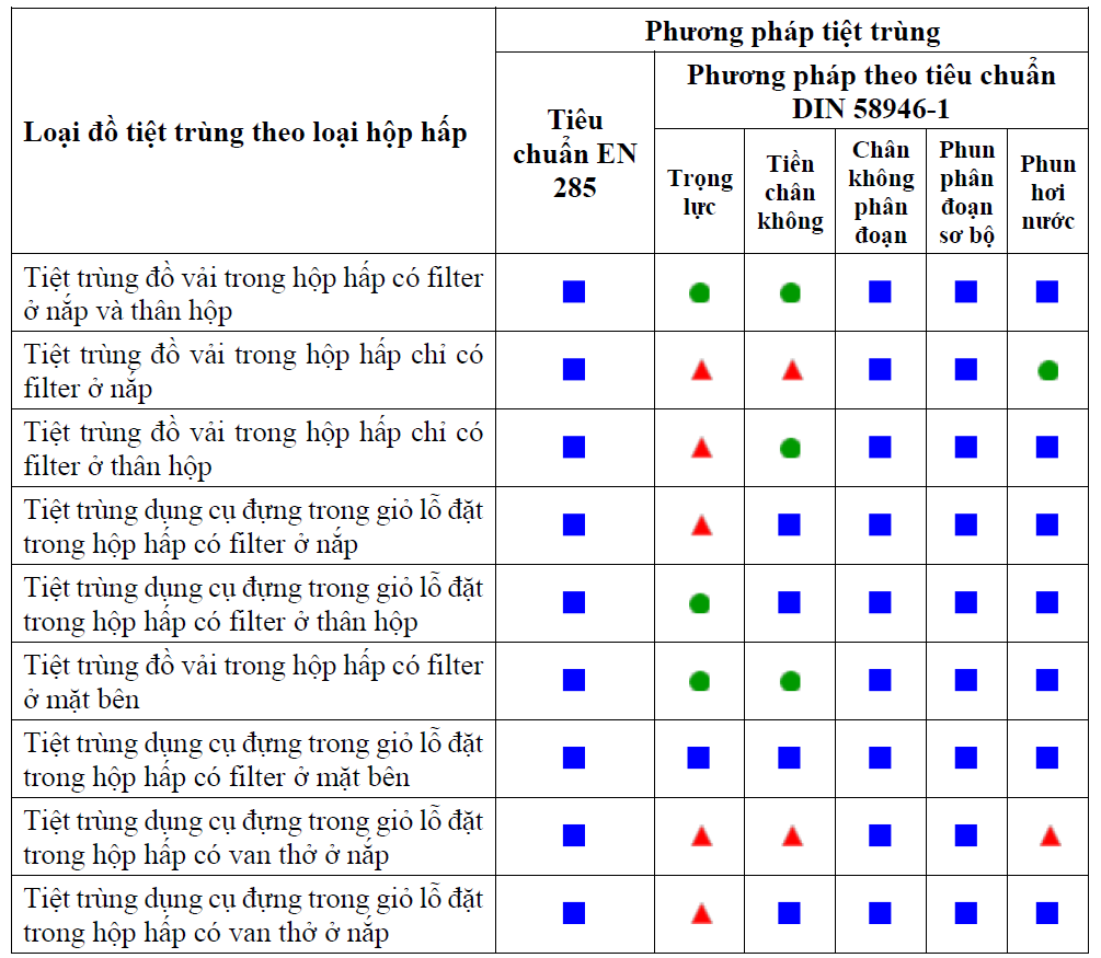 - Bảng này cung cấp thông tin về sự kết hợp đúng hoặc không đúng của các hộp hấp tiệt trùng để tránh lỗi tải hoặc lỗi sử dụng trong quá trình tiệt trùng được tiêu chuẩn hóa.
